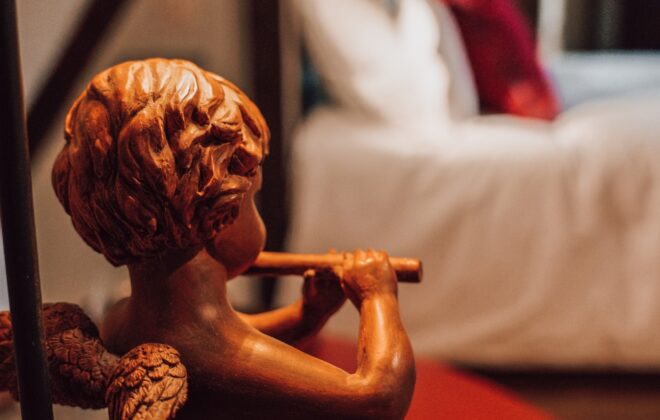 Entrez et observez ! Voyez notre petit angelot musicien posé sur le bureau, la petite cage dorée ouverte avec une pointe de danseuse étoile à l’intérieur, mais que signifie cela ? Qui était cette femme ? Déesse de la beauté, de tous les arts et de la poésie, elle est celle qui inspire. Elle incite à vivre un amour audacieux, celui qui n’a pas peur de prendre des risques, celui qui est résilient et brave tous les obstacles, telle une muse.
