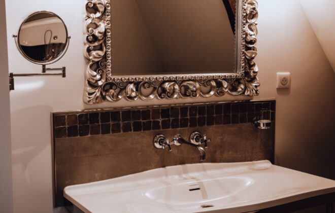 Ici, le baroque est roi. Une ambiance sophistiquée et chaleureuse, qui donne une touche de sensualité à l’ensemble. Miroir, oh mon beau miroir, celui qui nous rappellerait presque un conte…